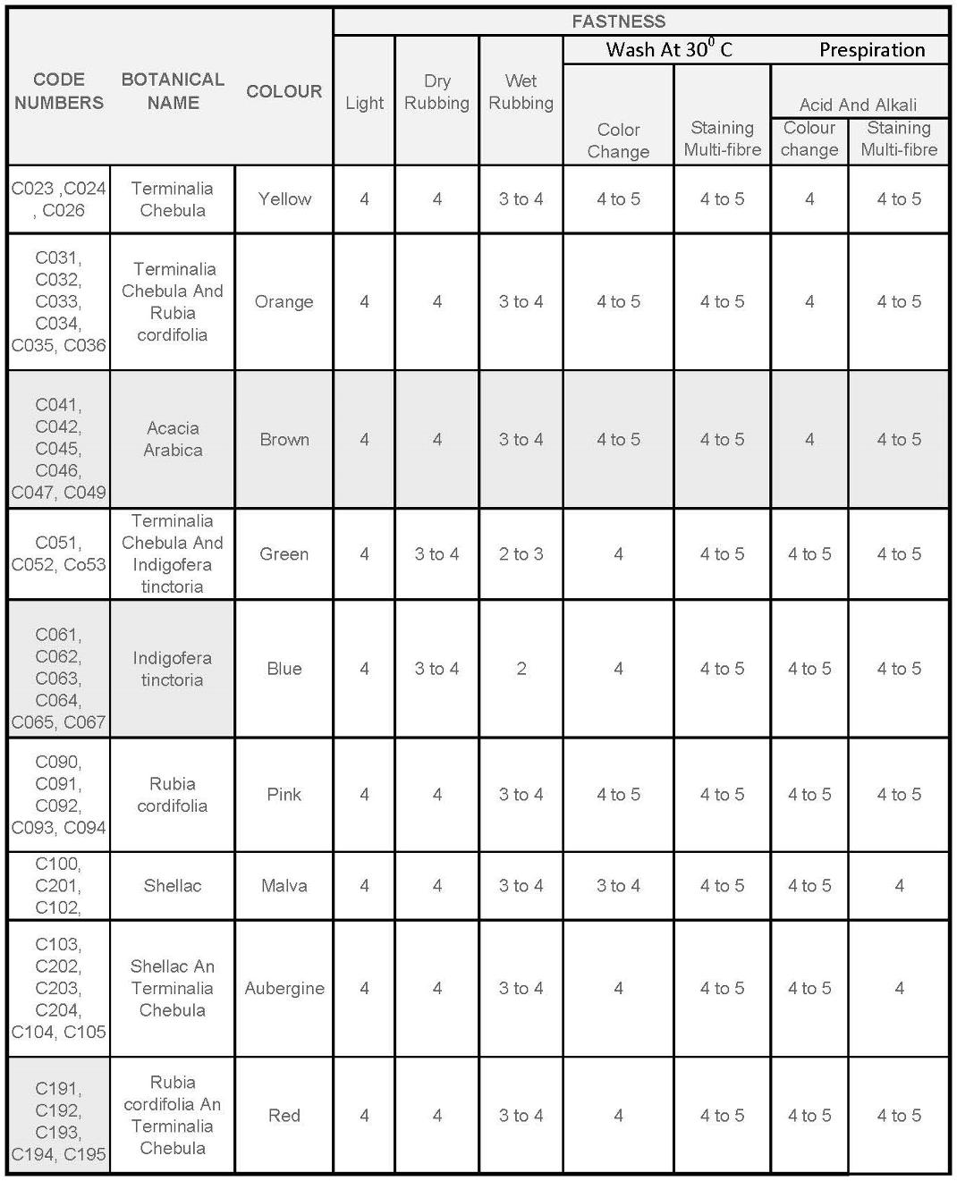 Cotton Fastness Table